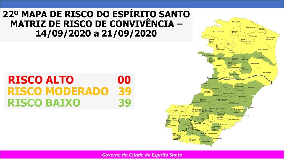 O Governo do Estado anunciou, nesta sexta-feira (11), o 22º Mapa de Risco Covid-19, que terá vigência entre a próxima segunda-feira (14) e o domingo (20). Ao todo, 39 municípios capixabas estão classificados em Risco Baixo e outros 39 estão em Risco Moderado. Não há nenhum município em Risco Alto. O Mapa foi construído seguindo a metodologia da 5ª Fase da Matriz de Risco de Convivência, anunciada no final de agosto.