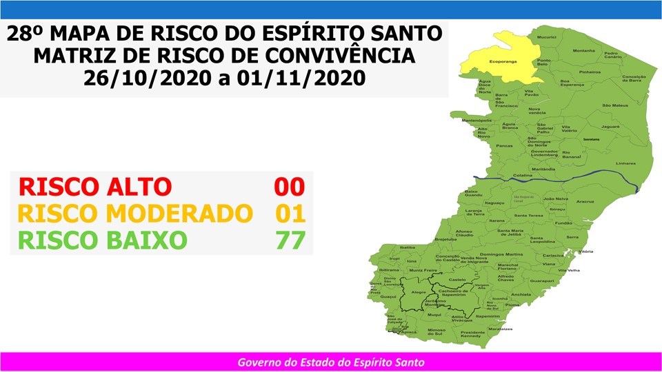 O Governo do Estado anunciou, nesta sexta-feira (23), o 28º Mapa de Risco Covid-19, que terá vigência entre a próxima segunda-feira (26) e o domingo (1º). Dos 78 municípios capixabas, 77 estão classificados em Risco Baixo. Apenas o município de Ecoporanga está em Risco Moderado. Não há nenhum município em Risco Alto.