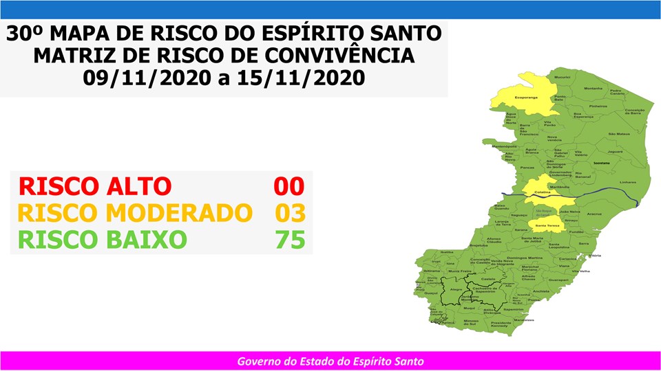 O Governo do Estado anunciou, neste sábado (07), o 30º Mapa de Risco Covid-19, que terá vigência entre a próxima segunda-feira (09) e o domingo (15). Do total de municípios capixabas, 75 estão classificados em Risco Baixo. Apenas três estão em Risco Moderado (Colatina, Ecoporanga e Santa Teresa). Não há nenhum município em Risco Alto.