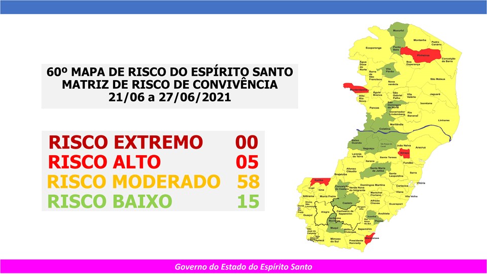 O Governo do Estado anunciou, nesta sexta-feira (18), o 60º Mapa de Risco Covid-19, que terá vigência desta segunda-feira (21) até o próximo domingo (27). Dos 78 municípios capixabas, 15 estão classificados em Risco Baixo, 58 em Risco Moderado e cinco em Risco Alto.