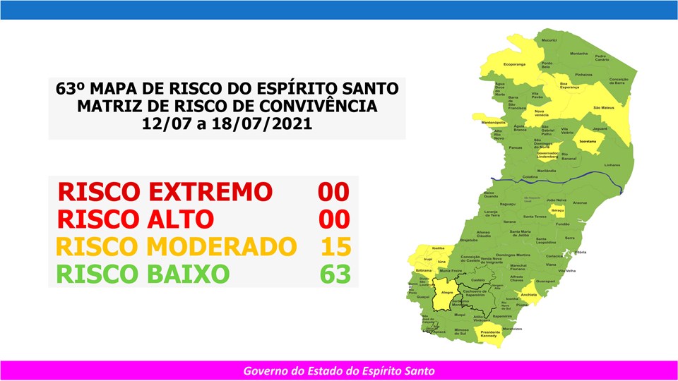 O Governo do Estado anunciou, nesta sexta-feira (09), o 63º Mapa de Risco Covid-19, que terá vigência desta segunda-feira (12) até o próximo domingo (18). Dos 78 municípios capixabas, 63 estão classificados em Risco Baixo e 15 em Risco Moderado. Não há municípios classificados em Risco Alto.