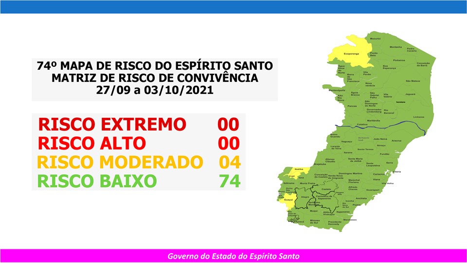 O Governo do Estado anunciou, nesta sexta-feira (24), o 74º Mapa de Risco Covid-19, que terá vigência desta segunda-feira (27) até o próximo domingo (03). Dos 78 municípios capixabas, 74 estão classificados em Risco Baixo e somente quatro (Ecoporanga, Guaçuí, Ibatiba e Irupi) em Risco Moderado.