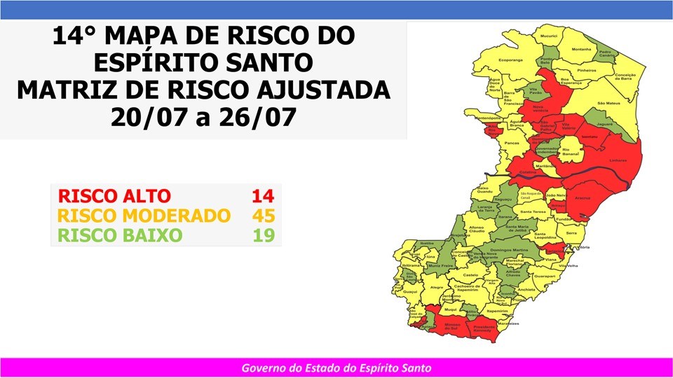 O Governo do Estado anunciou, neste sábado (18), o 14º Mapa de Risco Covid-19, que terá vigência entre a próxima segunda-feira (20) e o domingo (26). Com a redução da taxa global de ocupação dos leitos de UTI no Estado para abaixo de 80%, 19 municípios capixabas foram classificados em Risco Baixo. Outros 45 estão em Risco Moderado e 14 em Risco Alto. Foi anunciado também um novo ajuste na metodologia da Matriz de Risco, que passará a considerar no Coeficiente de Incidência somente os casos ativos do novo Coronavírus (Covid-19).