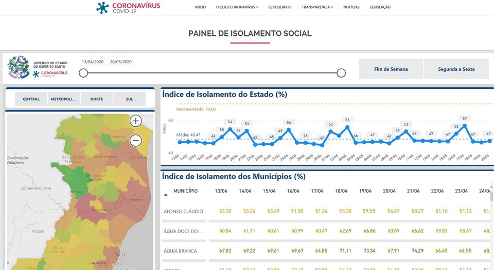 O Governo do Estado lançou, nesta quinta-feira (21), mais uma funcionalidade no site do Coronavírus (www.coronavirus.es.gov.br): o painel público com os dados do índice de isolamento social em cada município do Espírito Santo. As informações são fornecidas pelas operadoras de telefonia móvel, que monitoram o deslocamento dos usuários de celulares – os dados são aglutinados e anonimizados para não desrespeitar a privacidade do cada cidadão. O painel foi criado pelo Instituto de Tecnologia da Informação e Comunicação do Estado do Espírito Santo (Prodest) em formato Power BI.